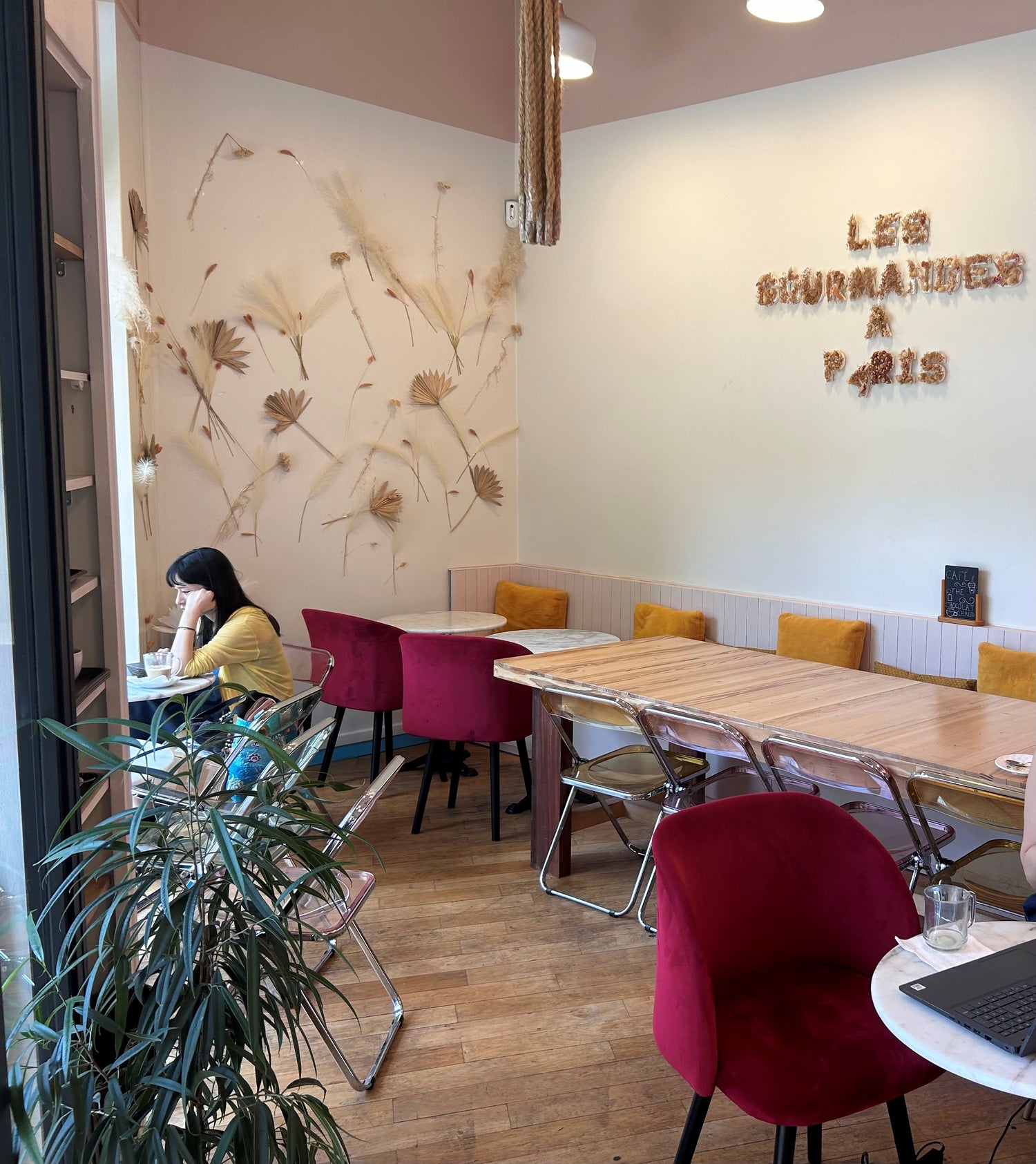 À l’intérieur, Les Gourmandes à Paris vous accueille dans un espace chaleureux et réconfortant, où chaque détail a été pensé pour que l’on s’y sente bien. Bois clair, couleurs douces, objets choisis avec soin… l’ambiance est douce, conviviale, presque comme à la maison. Un cocon idéal pour savourer une pause sucrée ou salée, à tout moment de la journée.